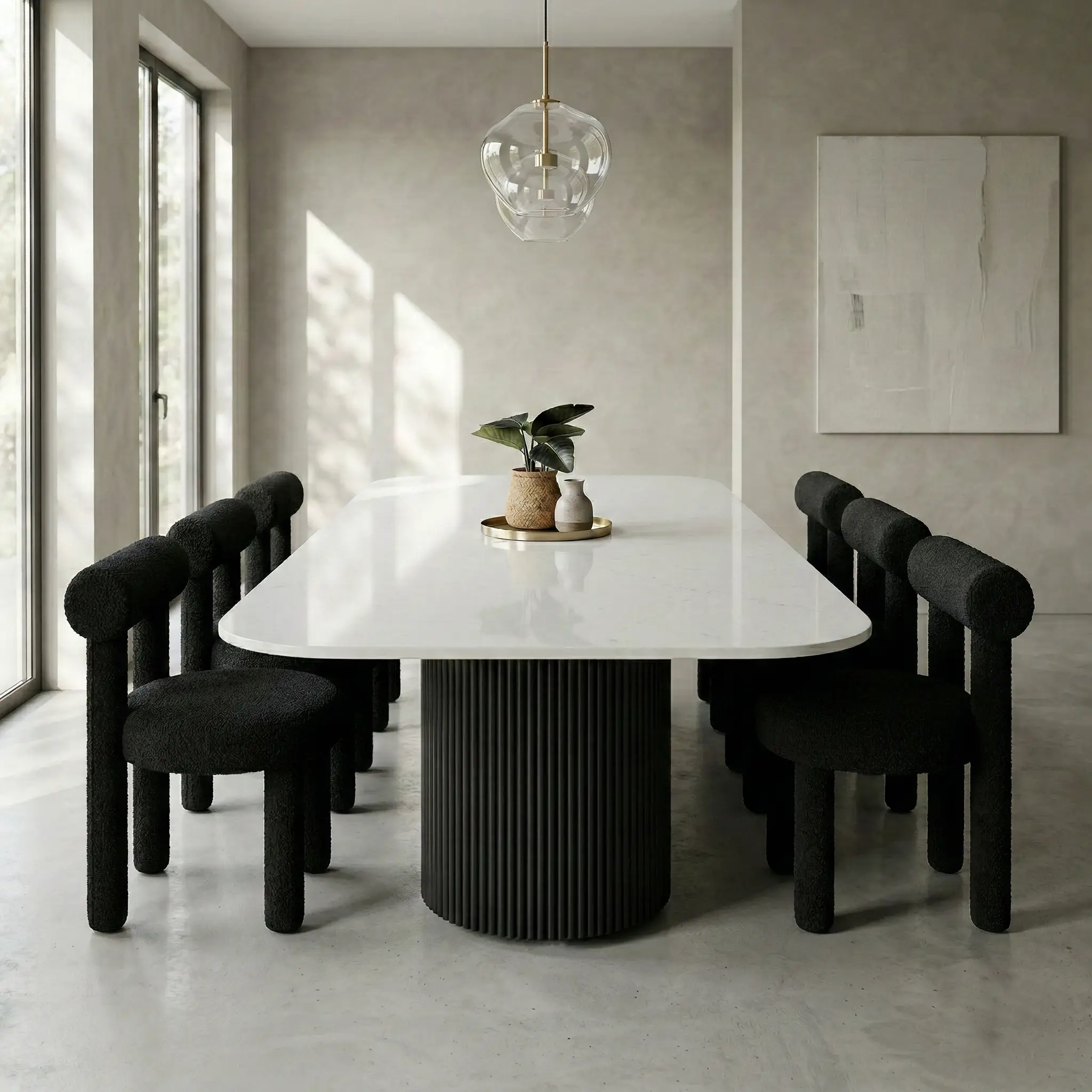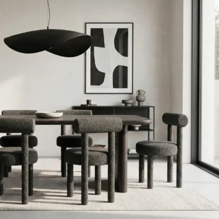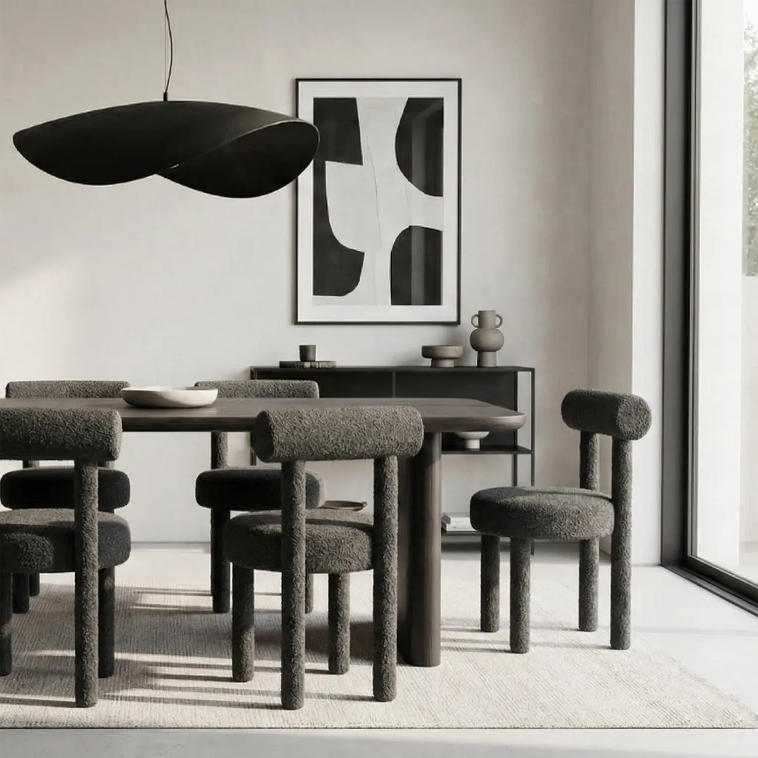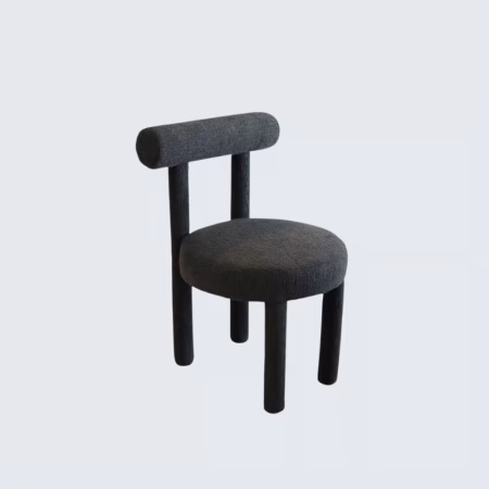 • The distinctive feature of the Froyo Chair lies in its rolled cylindrical backrest, offering not only ergonomic support but also a touch of understated luxury. The plush boucle fabric upholstery envelops you in comfort, inviting you to relax and unwind after a long day.