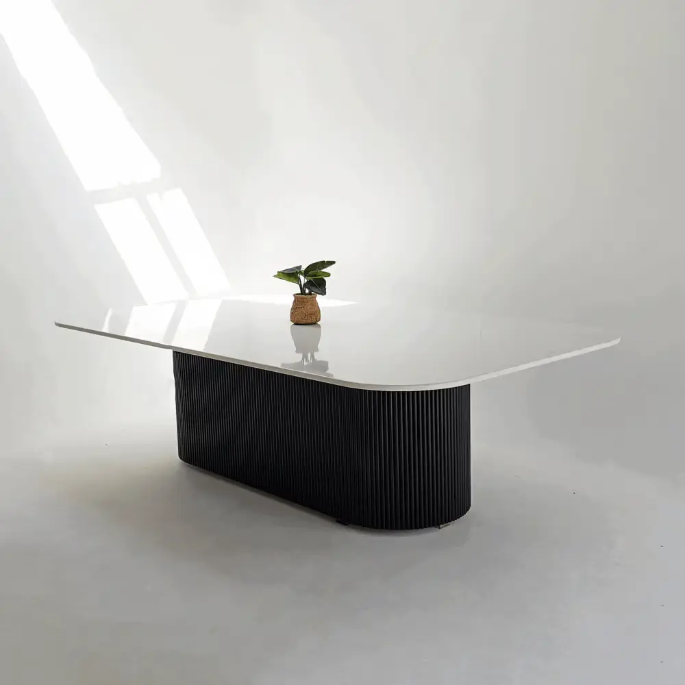 The Ghasaro Dining Table is a striking statement piece that blends modern elegance with durable craftsmanship. Designed with a smooth White Quartz top and supported by fluted wooden legs, it offers a refined balance of texture and contemporary form. Measuring 268L x 150W x 75H cm, this expansive table provides generous seating space—perfect for large family gatherings, formal dining rooms, or stylish entertaining areas. With its clean lines and sculptural base, the Ghasaro Dining Table brings both function and visual impact to any interior.