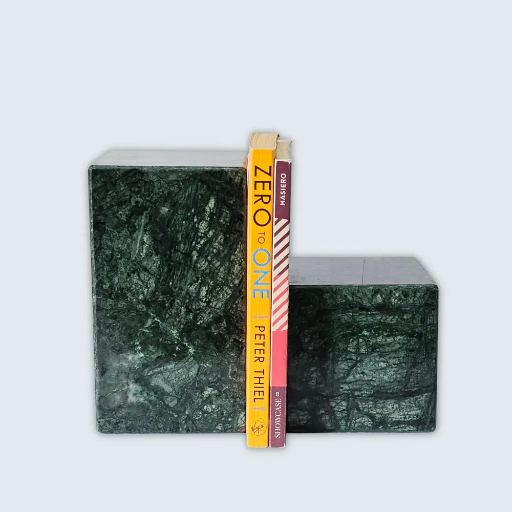 Elevate your bookshelf with the timeless elegance of the Green Marble Decorative Bookends. Handcrafted from premium marble, these bookends feature a sleek, polished finish that adds a touch of sophistication to any space. Their minimalist cube design not only provides sturdy support for your books but also serves as a stylish accent piece. Whether placed in a home library, office, or living room, these bookends seamlessly blend functionality with aesthetic appeal.