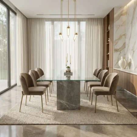 Grego Dining Table The Grego Dining Table is a striking fusion of natural elegance and modern design, making it a standout piece in any dining space. Its taupe silk marble top, adorned with subtle gray veins, offers a sophisticated surface that complements the unique rectangular shape with curved corners and bulging sides. The table is supported by sturdy walnut veneer legs, providing both durability and a warm, organic touch. With dimensions of 180 cm x 100 cm x 75 cm, the Grego Dining Table comfortably accommodates gatherings, combining style and functionality in a timeless design.
