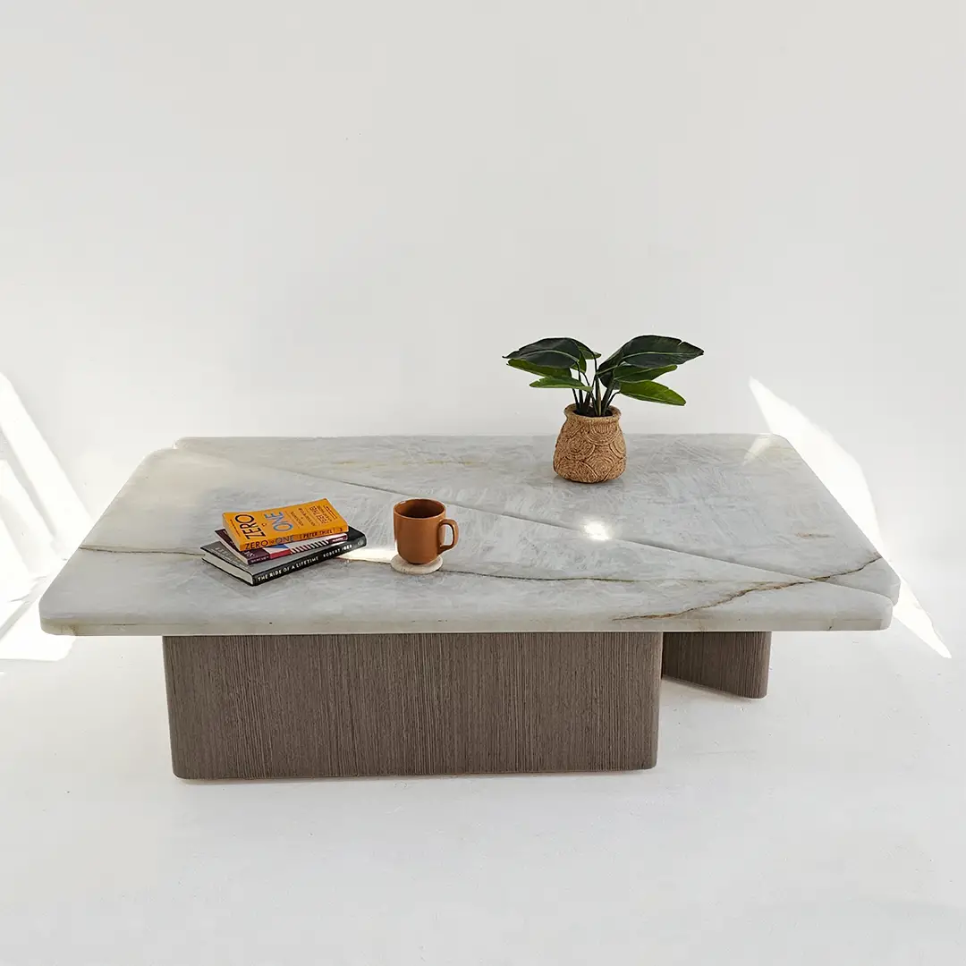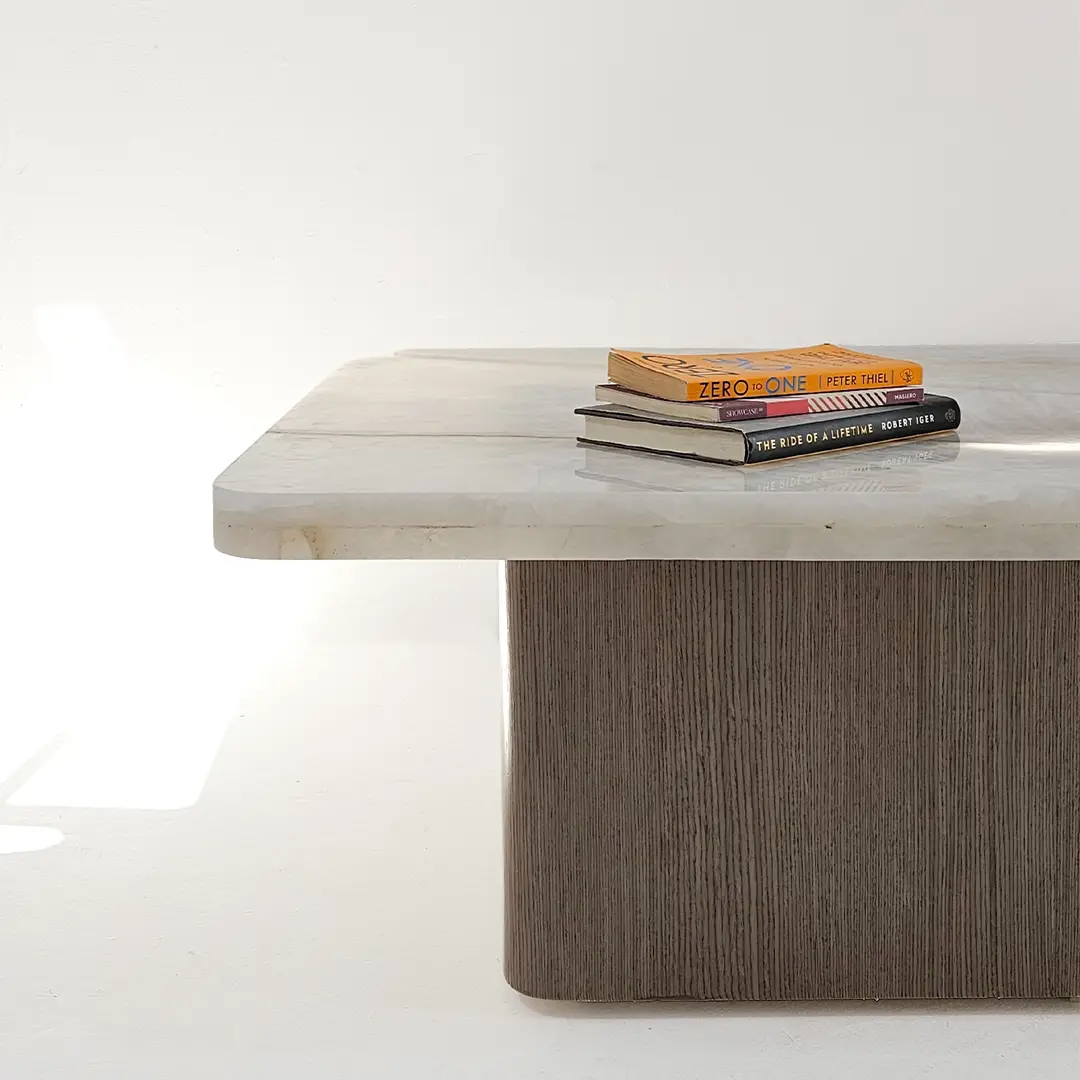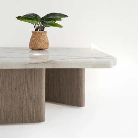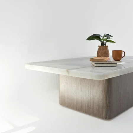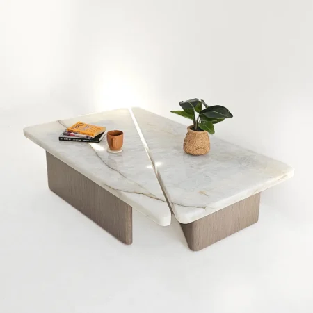 Hirona Coffee Table Set  is a versatile and stylish centerpiece for modern living spaces. This set includes two right-angled triangular tables that can be combined to form a square, offering both flexibility and functionality. The Onyx tops bring elegance and luxury, while the wood veneer legs add warmth and natural texture. Perfect for living rooms, it combines sophisticated design with practical use.