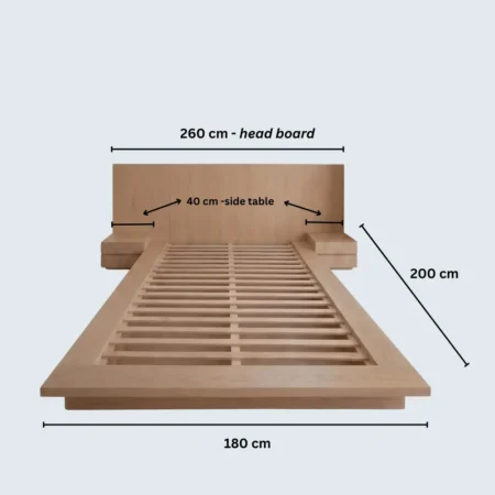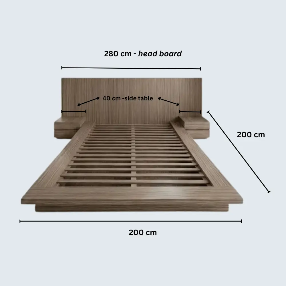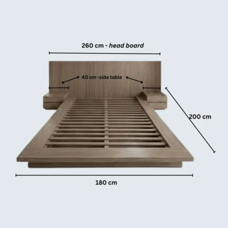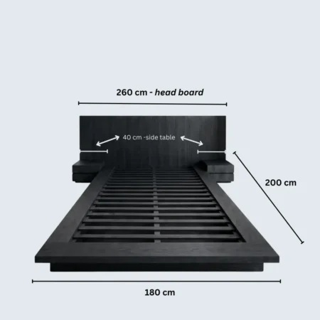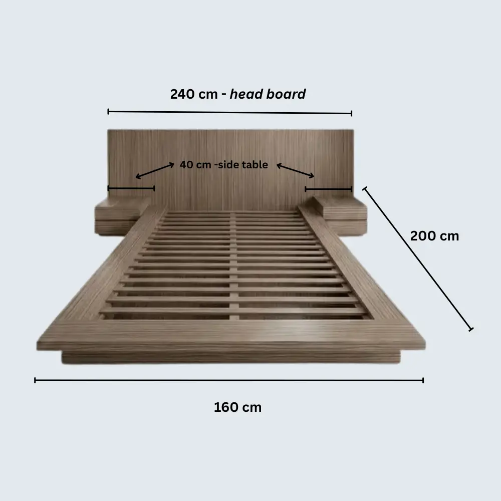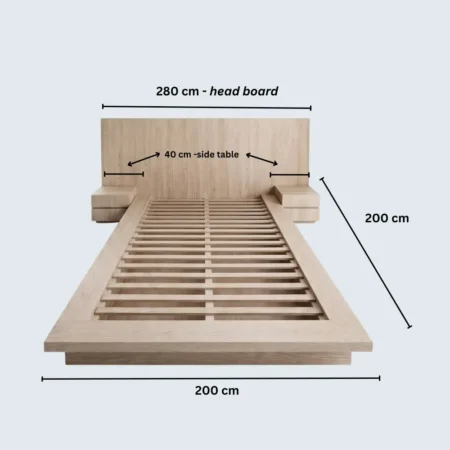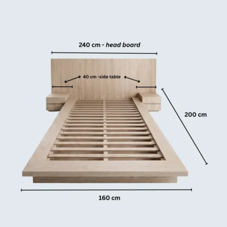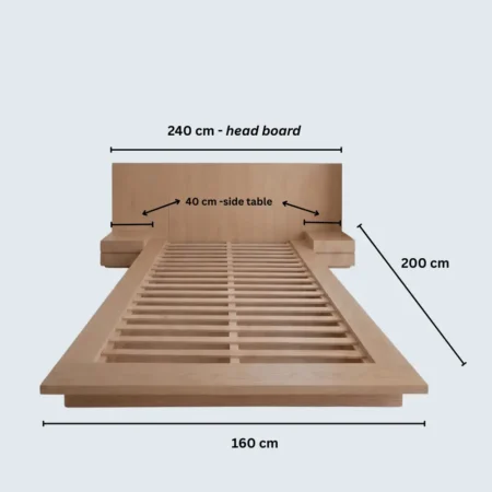 Thoughtfully designed, the headboard width extends an additional 80 cm to accommodate integrated side tables (40 cm on each side), enhancing both practicality and visual appeal.