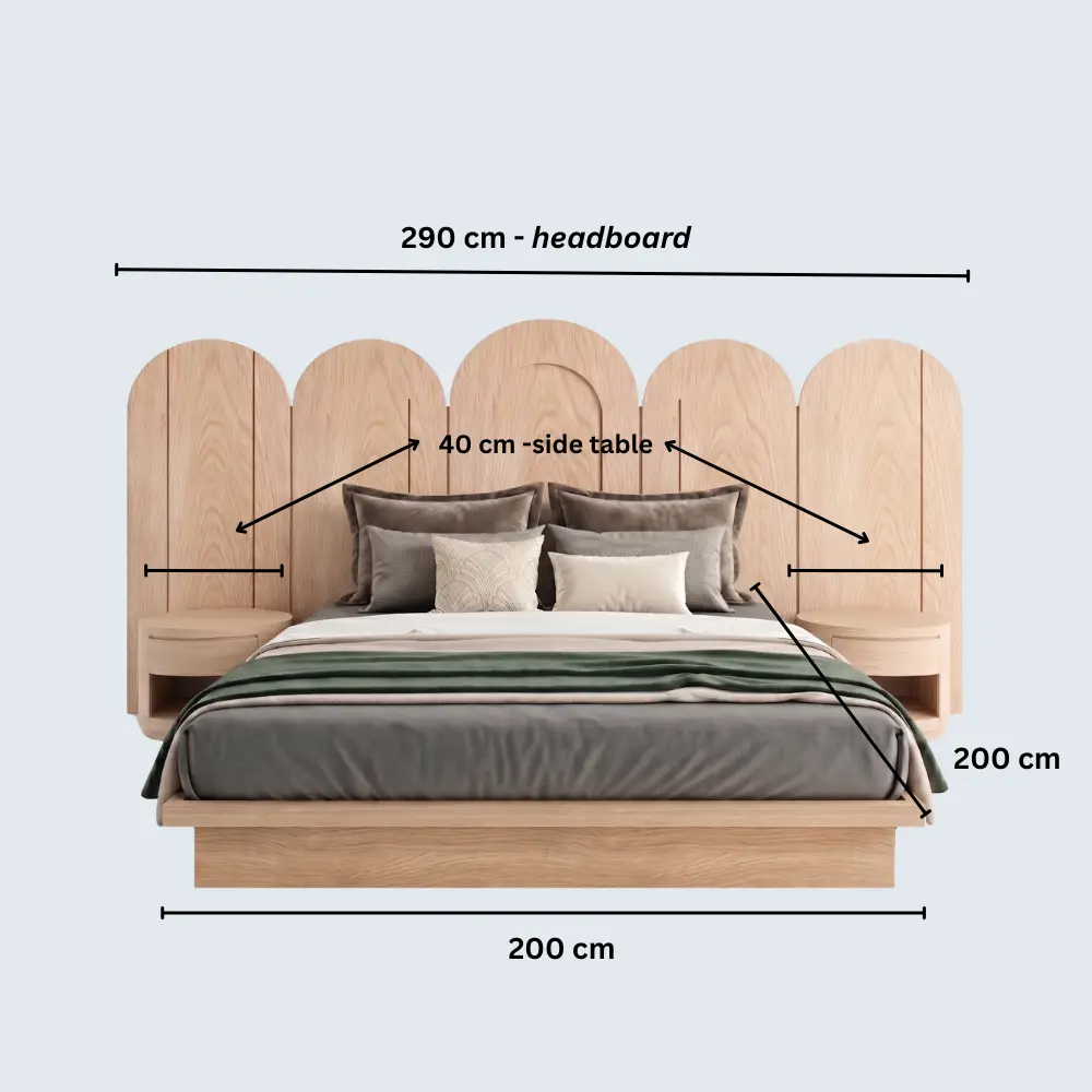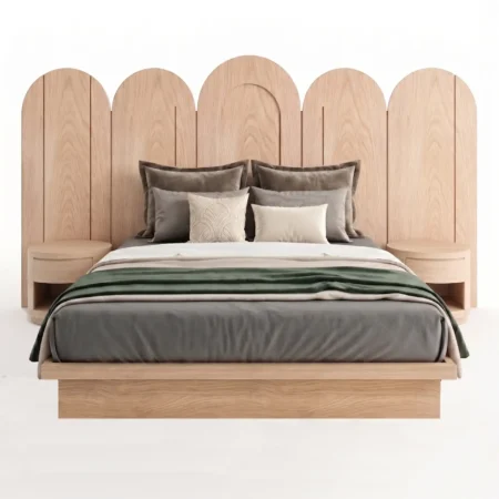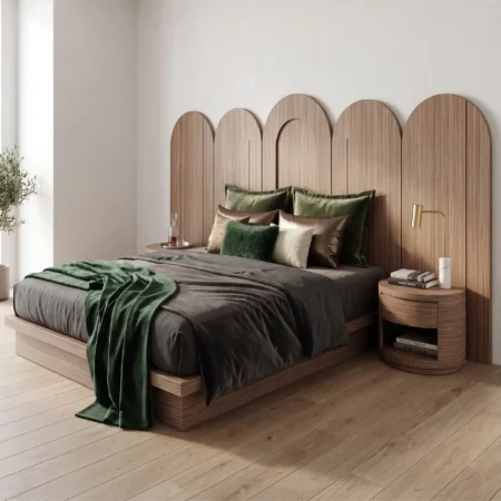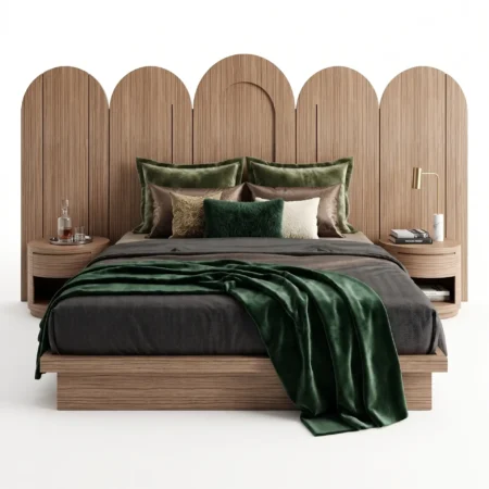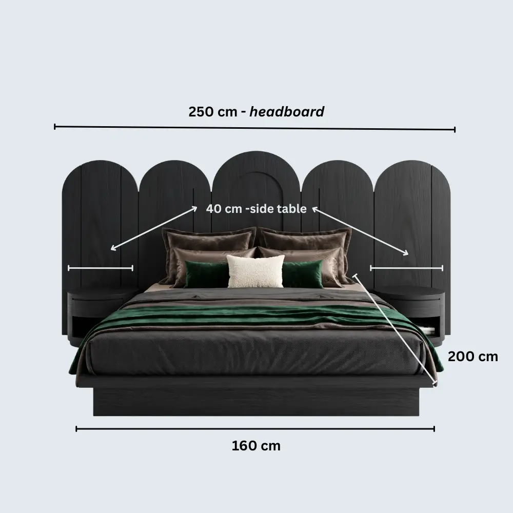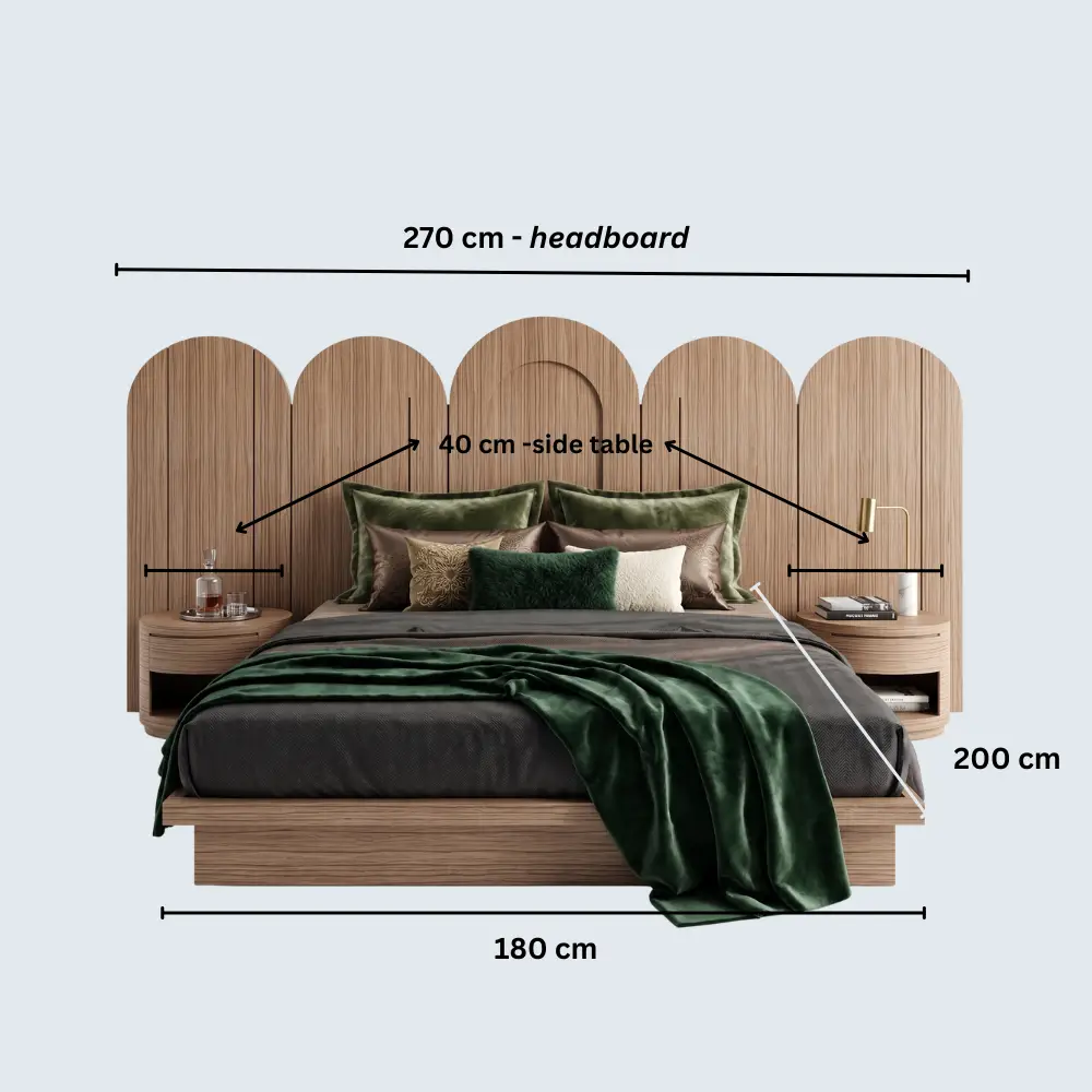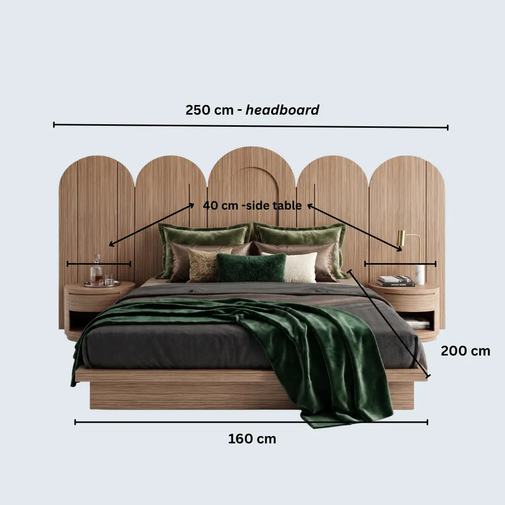 Crafted in premium veneer finishes, it is available in Black Veneer, White Oak, Red Oak, and Walnut Veneer—offering versatile options to complement a range of interior styles. Its distinctive five-panel headboard creates a rhythmic visual statement, while optional integrated curved side tables add seamless bedside convenience. Available with or without side tables, the Luna Arched Bed adapts effortlessly to different spaces and preferences.