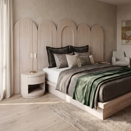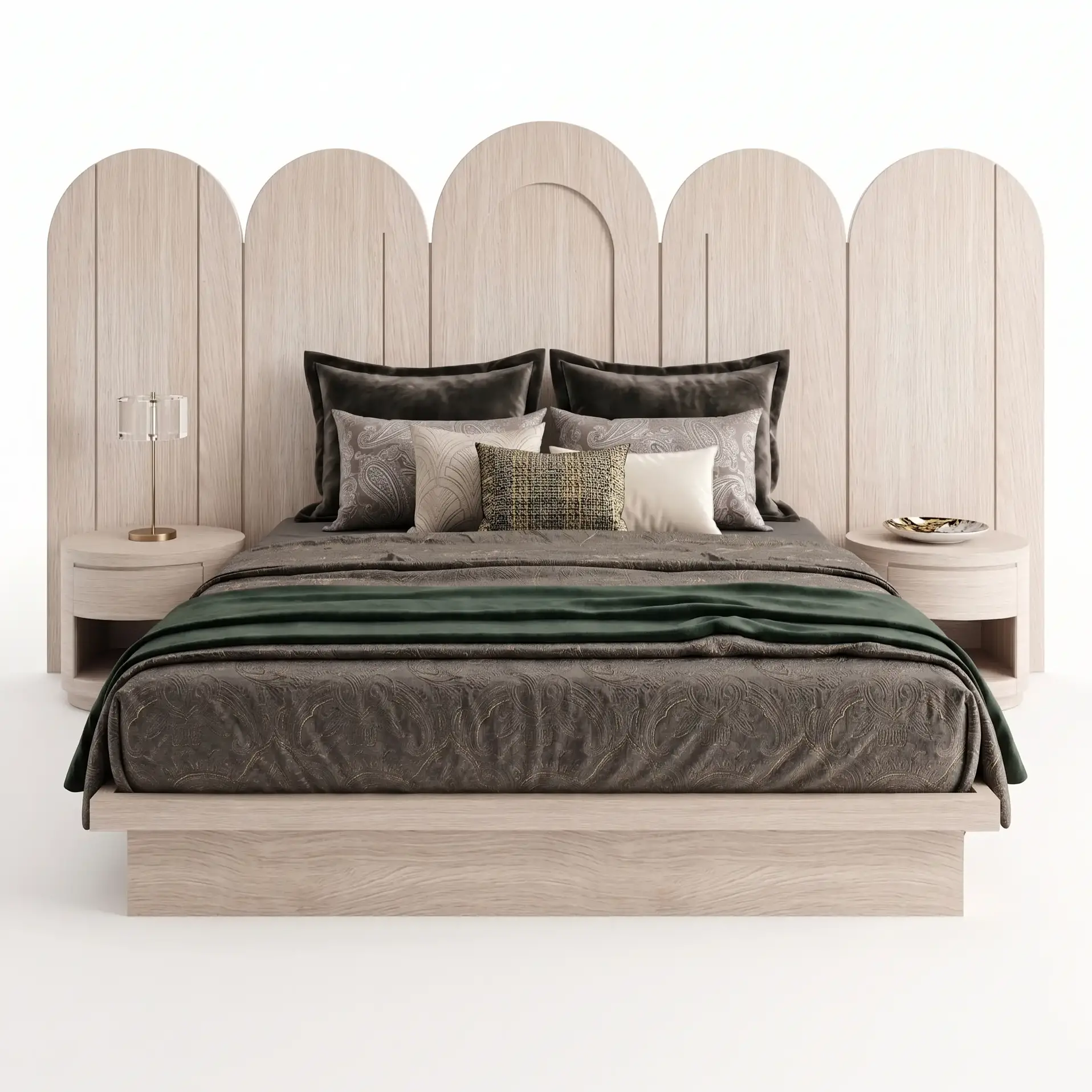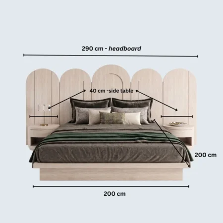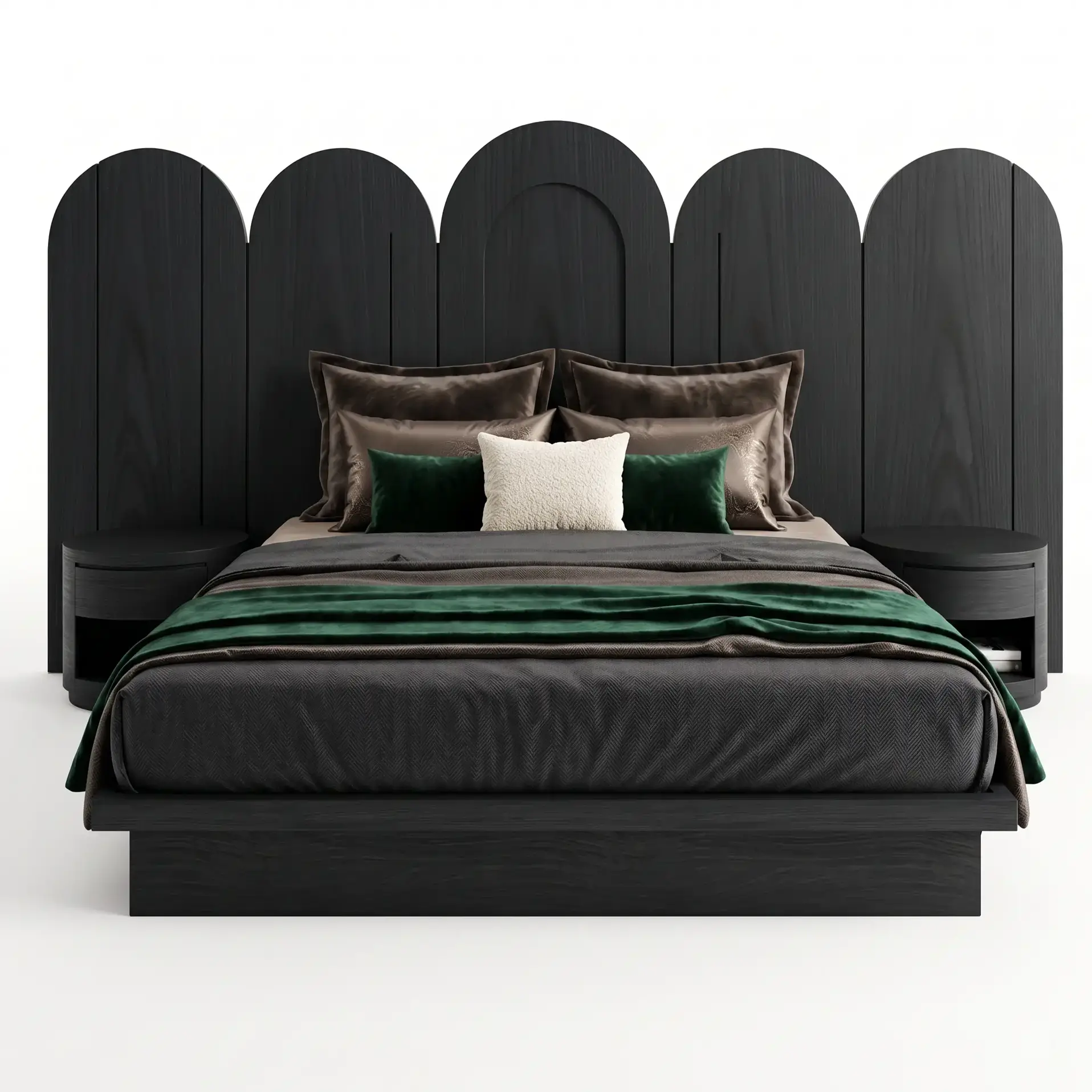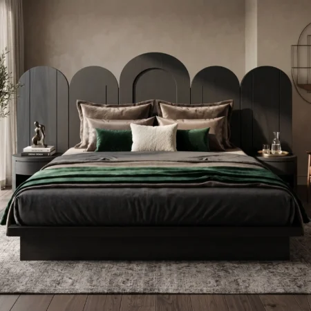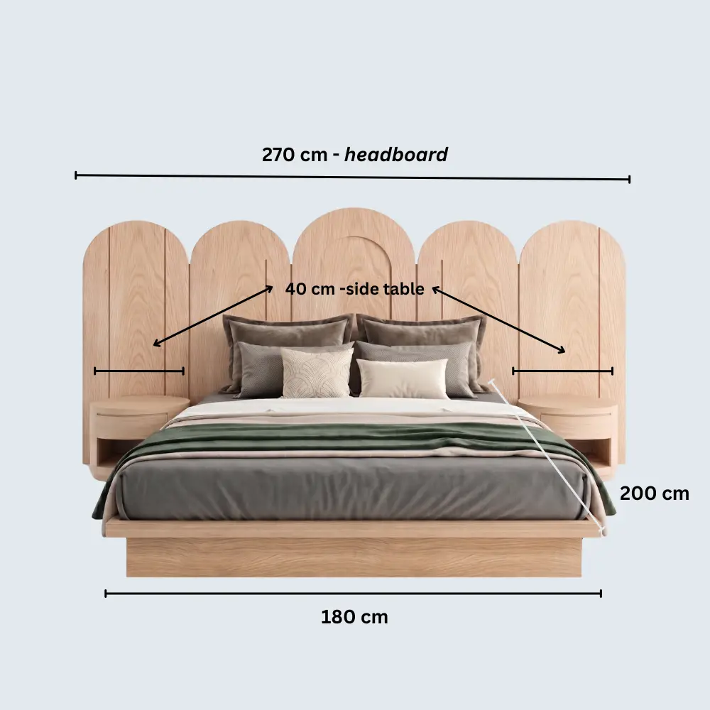 Crafted in premium veneer finishes, it is available in Black Veneer, White Oak, Red Oak, and Walnut Veneer—offering versatile options to complement a range of interior styles. Its distinctive five-panel headboard creates a rhythmic visual statement, while optional integrated curved side tables add seamless bedside convenience. Available with or without side tables, the Luna Arched Bed adapts effortlessly to different spaces and preferences.