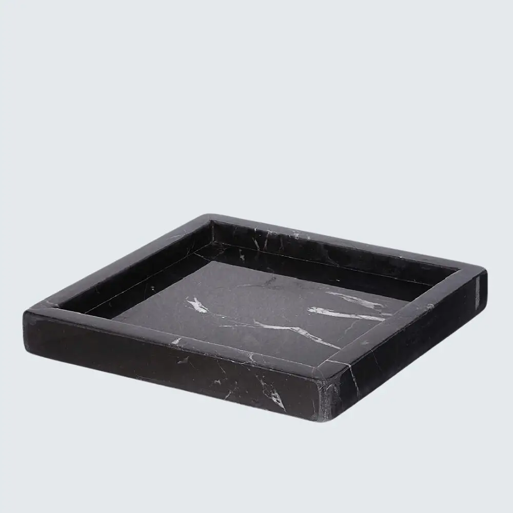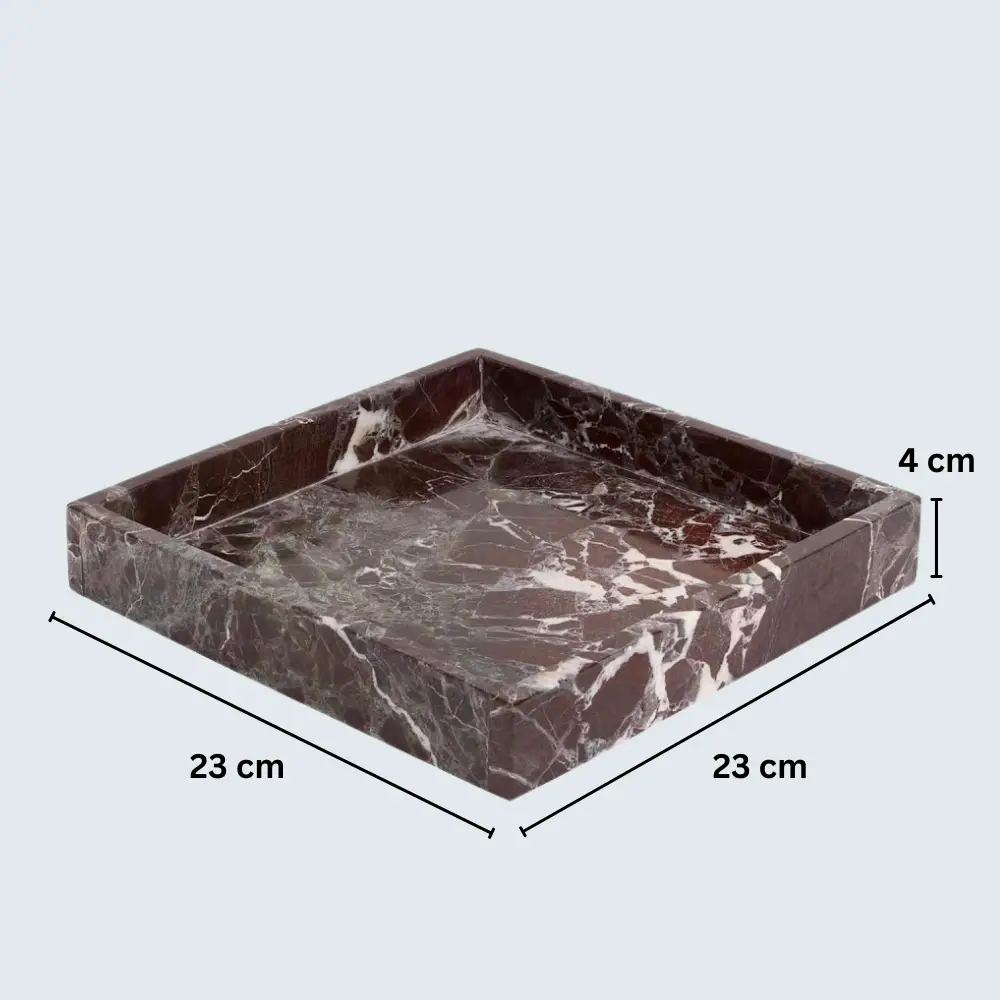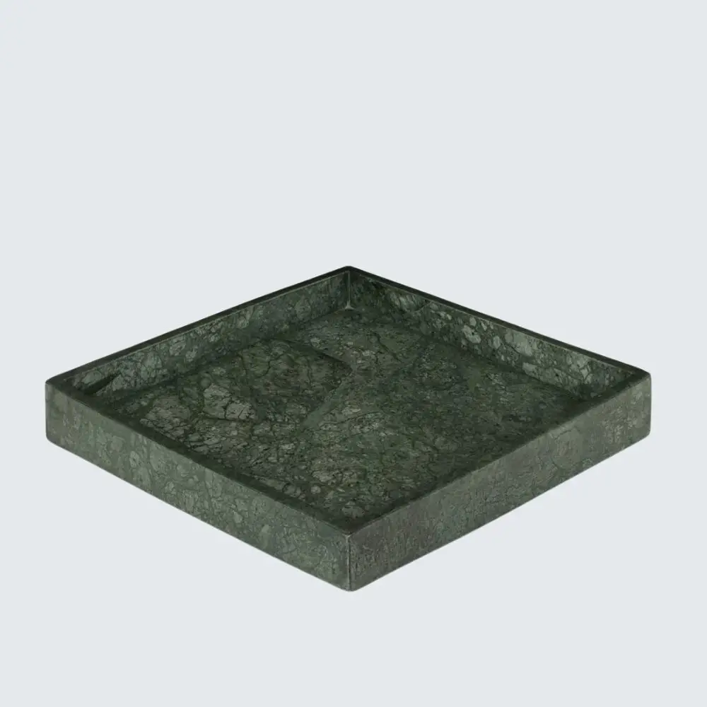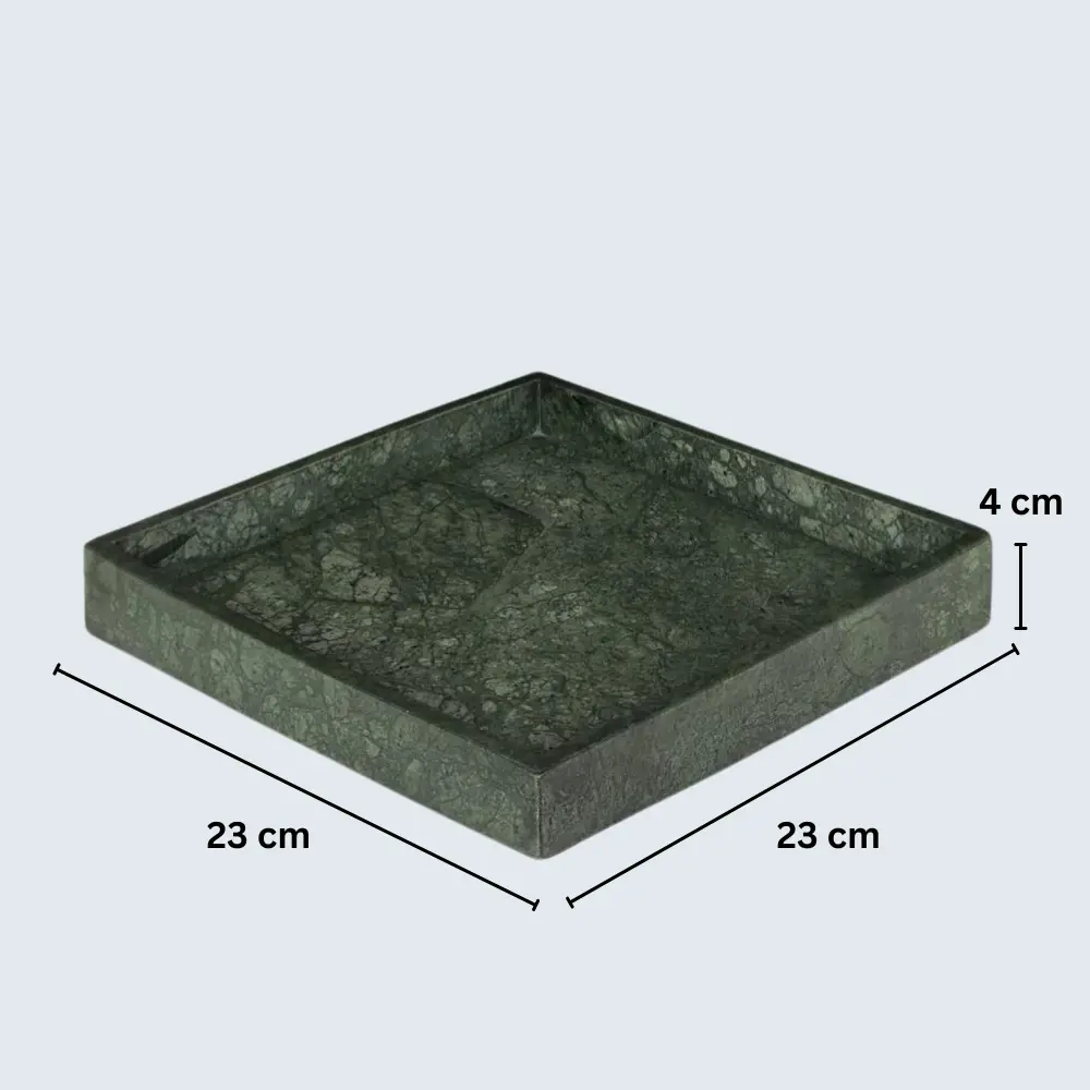 Marble Border Tray The Marble Border Tray is a versatile and elegant piece that seamlessly blends functionality with aesthetic appeal. Crafted from premium marble, each tray is unique due to the natural veining and patterns inherent in the stone. With dimensions of 23 cm x 23 cm and a thickness of 2 cm, it serves as an ideal platform for displaying perfumes, candles, or cosmetics on your vanity, or as a chic serving tray for fruits and nuts. Available in Beige, Black, Burgundy, Green, and White, this handcrafted tray adds a touch of sophistication to any space.