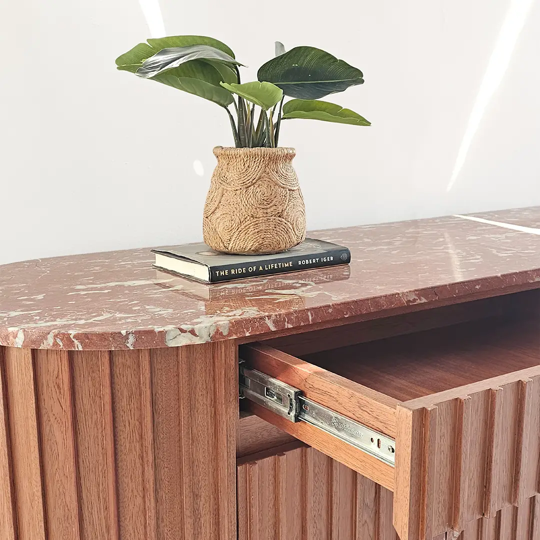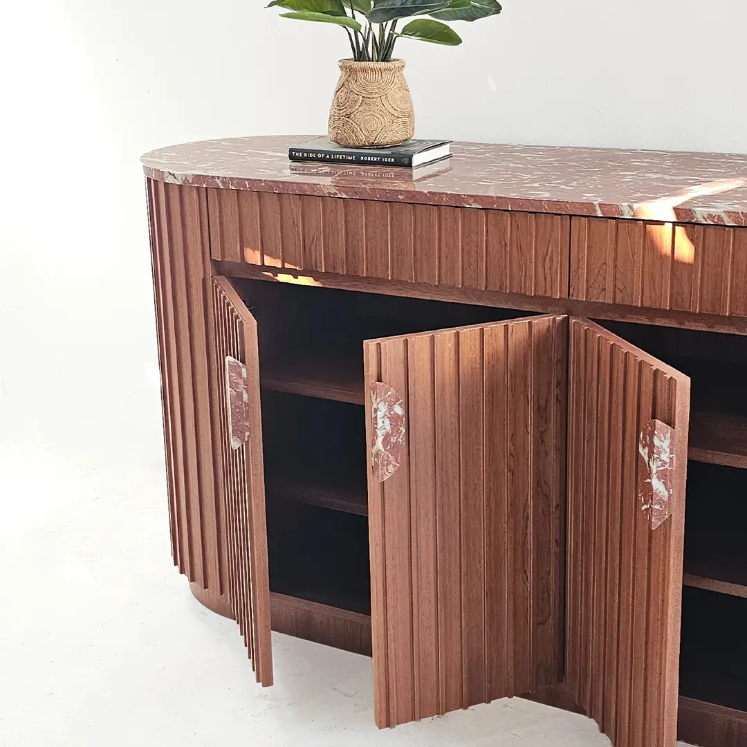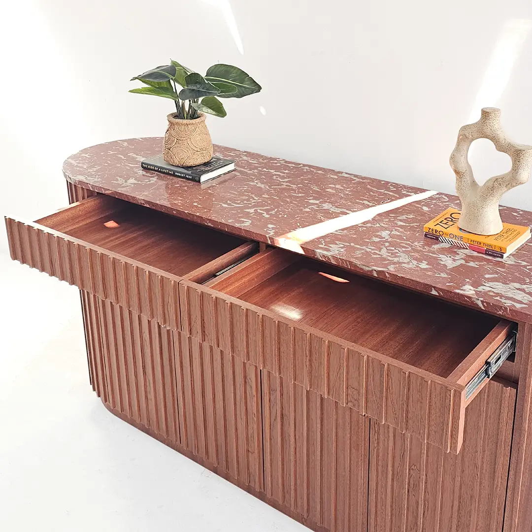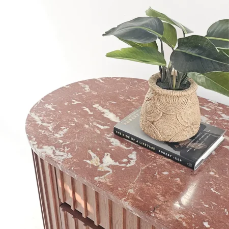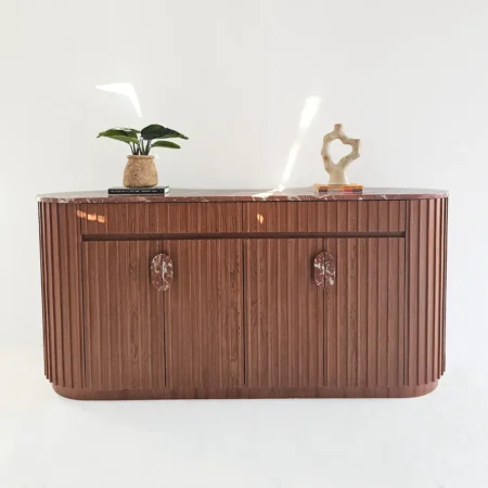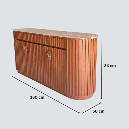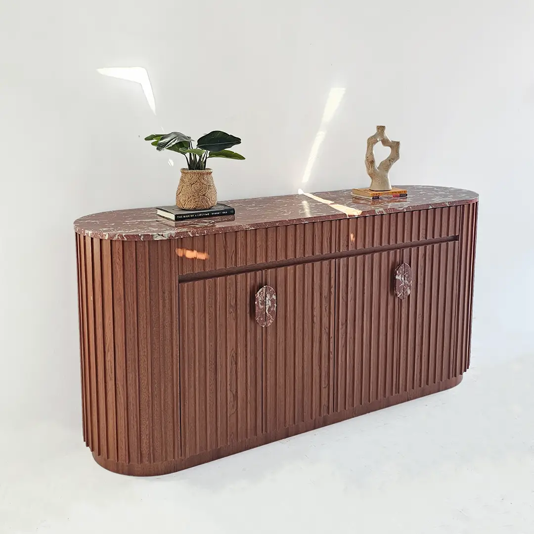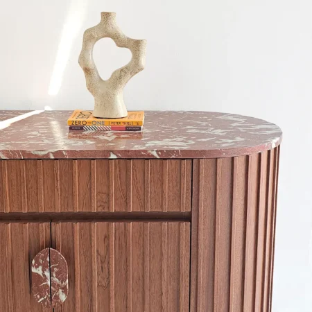 Noreen Console Table is a luxurious and functional piece that adds elegance to any entryway or living space. Featuring a striking red marble top and handles combined with a mahogany veneer ribbed-pattern wood base, it blends striking design with practical storage. The pull-open drawers and cupboards provide ample space while maintaining a clean, sophisticated look.