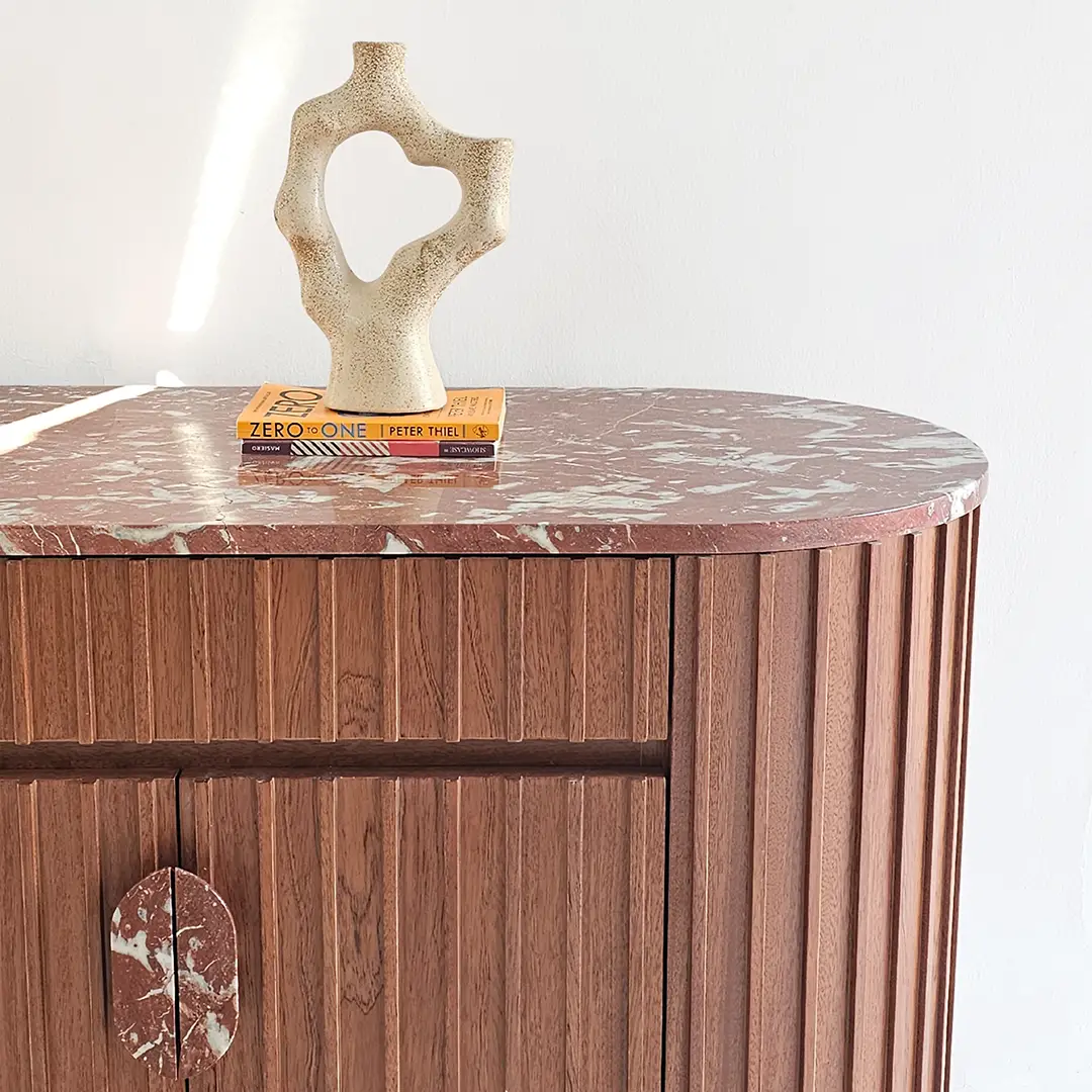 Material: Red Marble Top & Handles with Mahogany Veneer Ribbed Wood Base