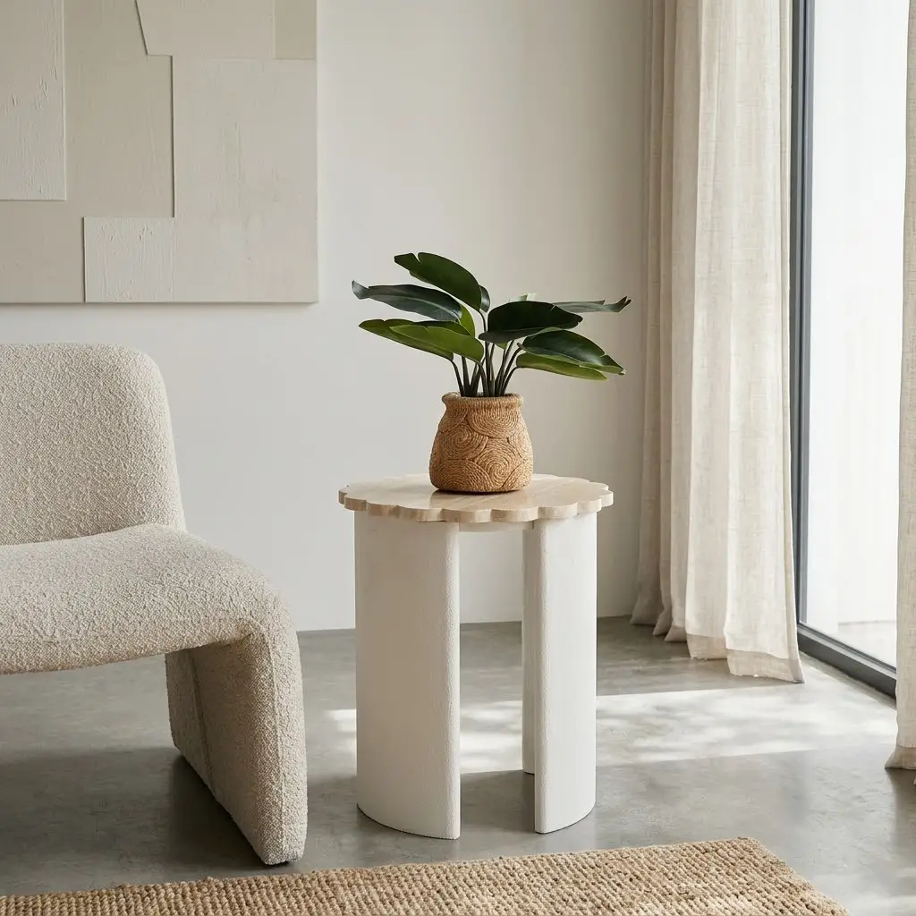 The Riva Side Table is a sculptural accent piece that seamlessly blends organic textures with a sleek, modern silhouette. Featuring a beautifully scalloped top crafted from premium travertine, this table brings natural elegance and timeless appeal to any corner of your home. The solid legs, finished in a textured paint, offer a tactile contrast and a contemporary grounding presence. Compact yet striking, the Riva is perfect as a bedside companion, sofa-side perch, or standalone statement piece.