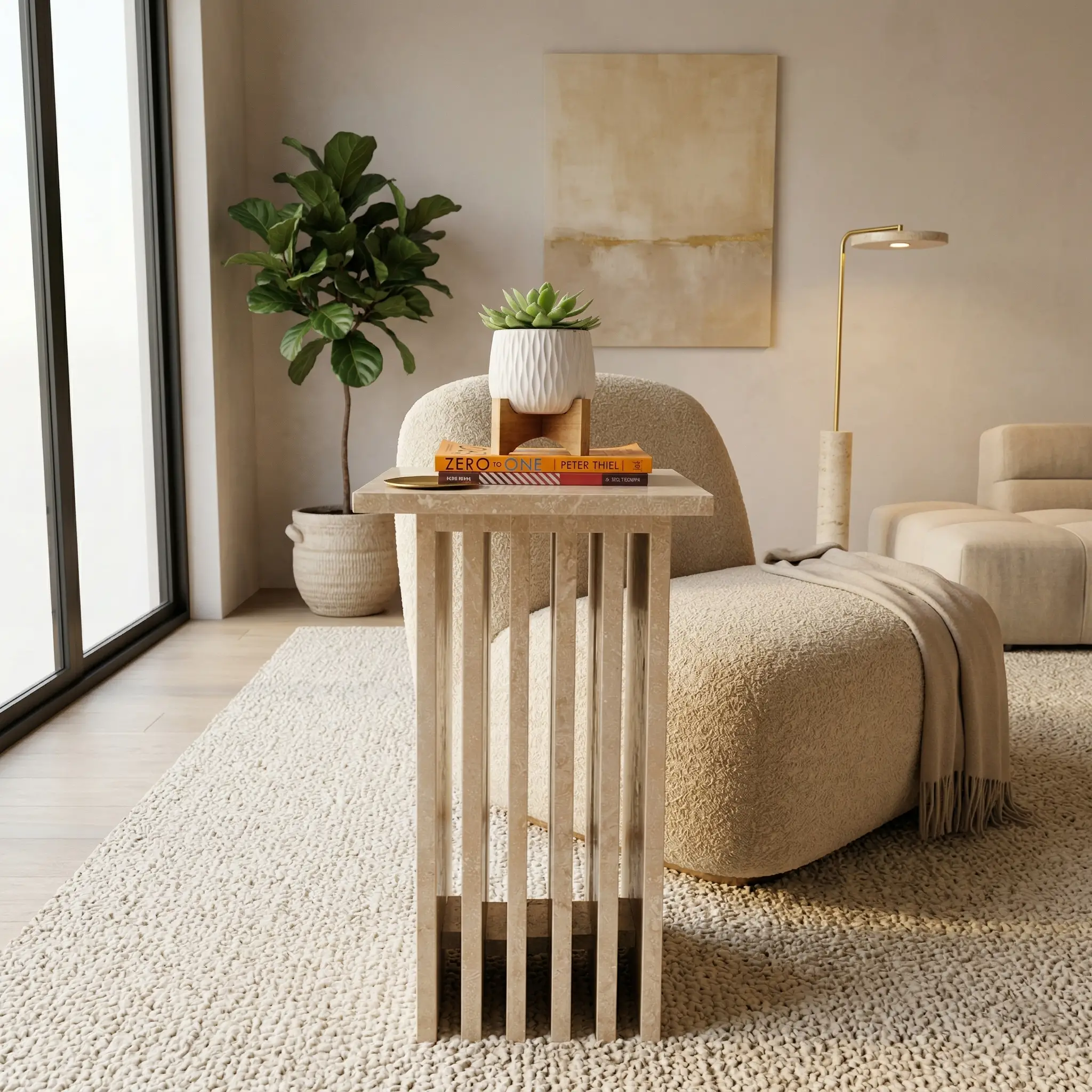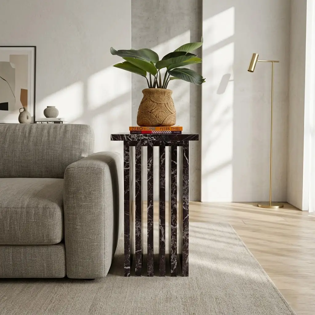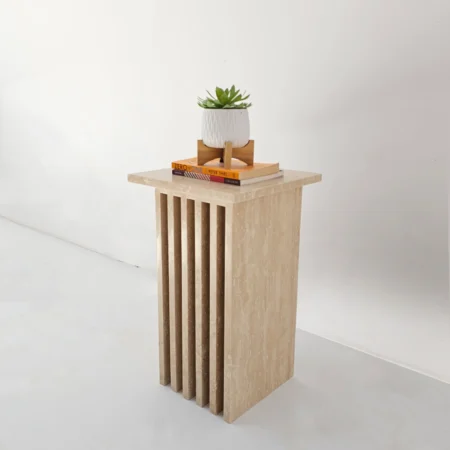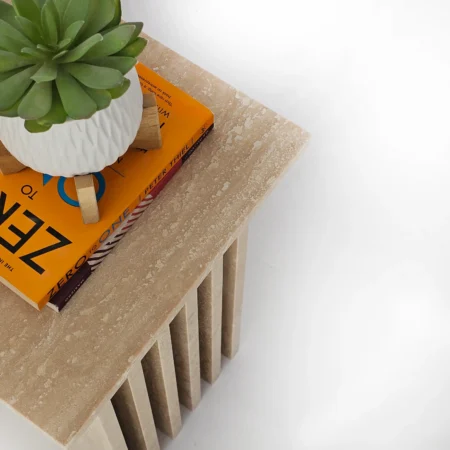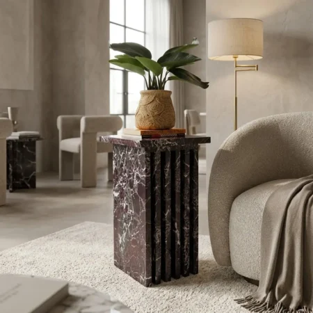 Add a refined statement to your living space with the Roni Side Table, where sculptural design meets timeless marble craftsmanship. Featuring a sleek vertical slat structure and a bold marble finish, this piece effortlessly blends contemporary style with luxurious appeal.