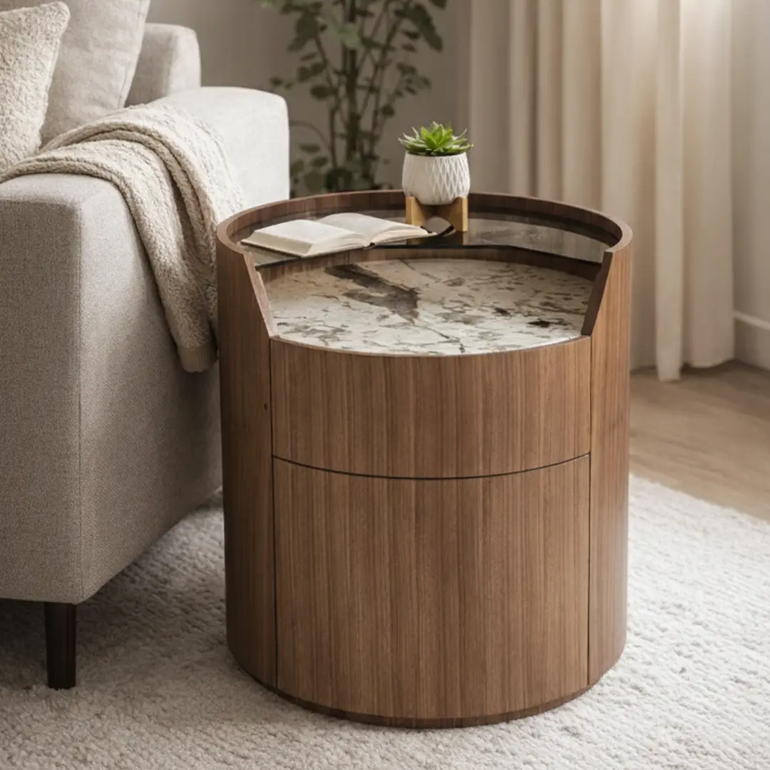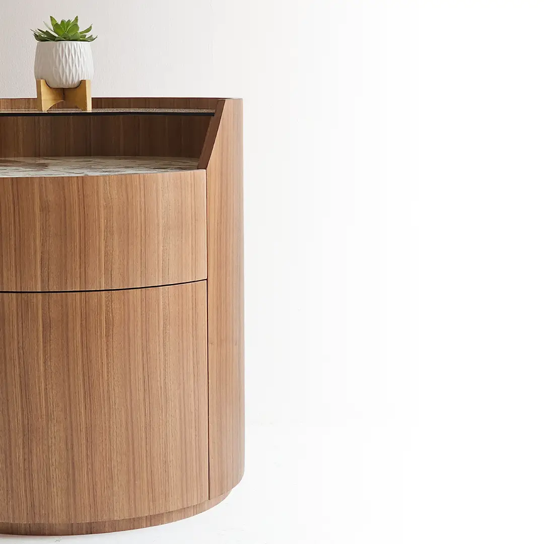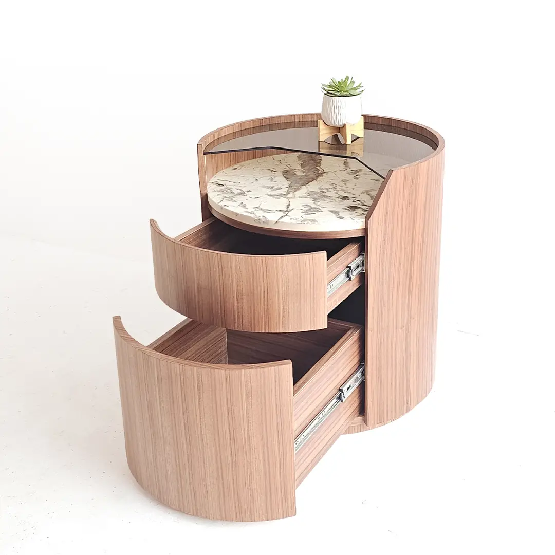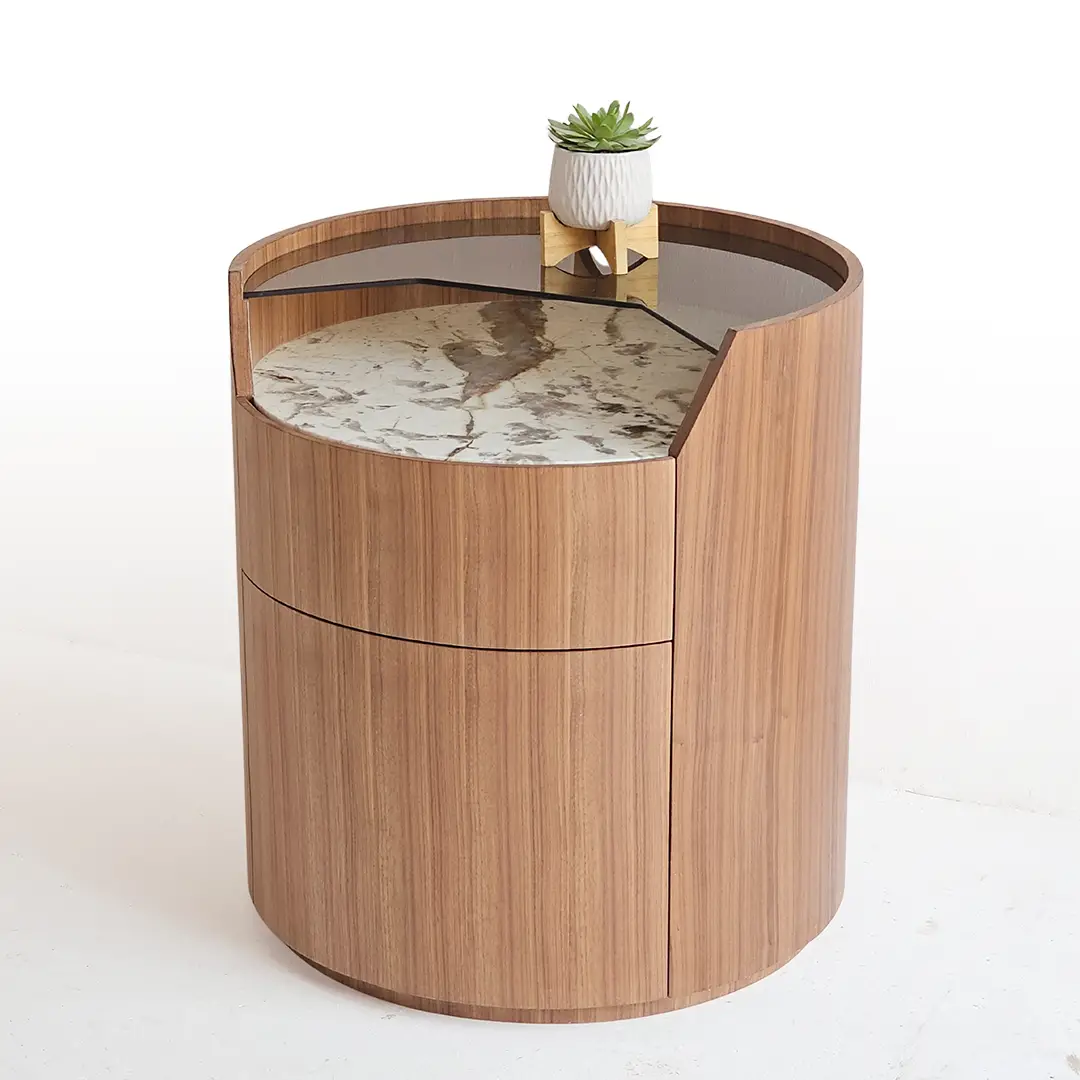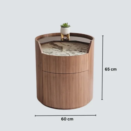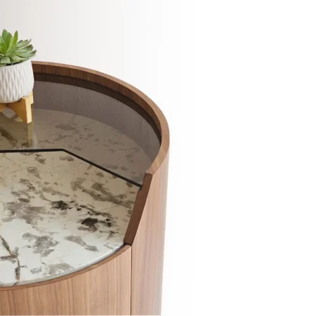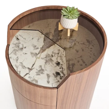 Sarella Side Table is a striking blend of modern design and functional elegance. Crafted with a walnut veneer quarter-cut cylindrical body, it features two soft-closing drawers for seamless storage. The tabletop combines brown-tinted glass with a Patagonia marble inlay, creating a visually dynamic surface that contrasts beautifully with the warm wood tones. Its rounded silhouette and mixed-material design make it a perfect statement piece for living rooms, bedrooms, or lounge areas.