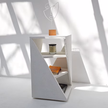 The Textured Rectangular Side Table with Shelves combines modern design with functionality. Featuring a sculptural twist-inspired form and a matte textured finish, this table serves as both a practical storage solution and a statement piece in your living space. Its compact size and dual open shelves make it perfect for small spaces, offering storage for books, decor, or daily essentials.