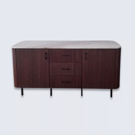 The Veneto Sideboard is a true testament to luxury craftsmanship, designed to bring an air of sophistication to your living space. Featuring a stunning beige marble top with striking brown veins, this sideboard adds depth and elegance to any room. Its sleek, fluted wooden body in a rich dark brown finish perfectly complements the marble, creating a refined look that suits both modern and classic interiors. With five doors offering generous storage space, this sideboard serves as both a functional piece and a statement of style. Ideal as a buffet table or sideboard cabinet, the Veneto Sideboard effortlessly blends luxury with practicality, making it a must-have for those seeking a timeless addition to their home.