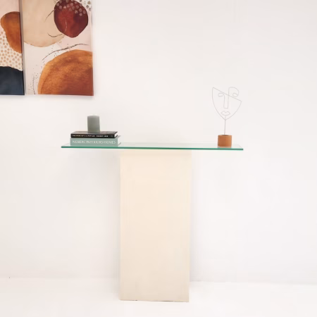 The Vetro Console is a harmonious blend of bold structure and airy elegance. Featuring a textured beige pillar base and a sleek glass top, this console table adds a touch of sophistication to any entryway or hallway. Its compact size makes it ideal for narrow spaces, while its versatile design complements both contemporary and transitional décor styles.